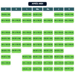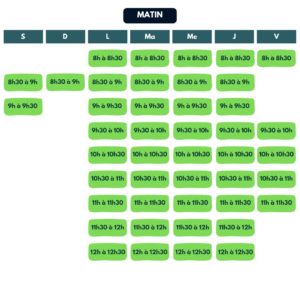 Par exemple : le mardi de 9h30 à 9h45, ou de 10h15 à 11h15 …